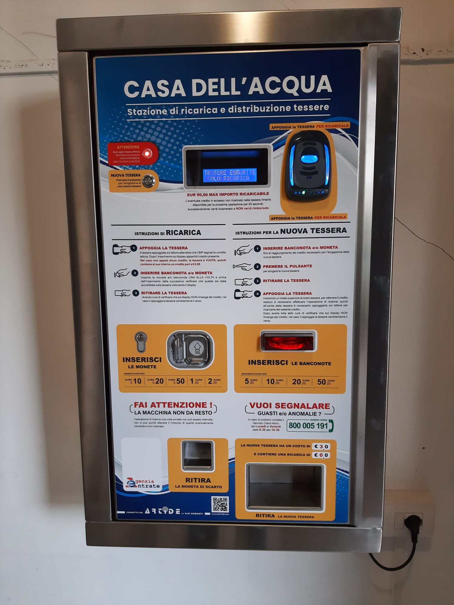 Il distributore non dà resto ed accetta sia banconote da 5 a 20 euro che monete da 10 centesimi a 2 euro. La tessera ha un costo di 3 euro cad.