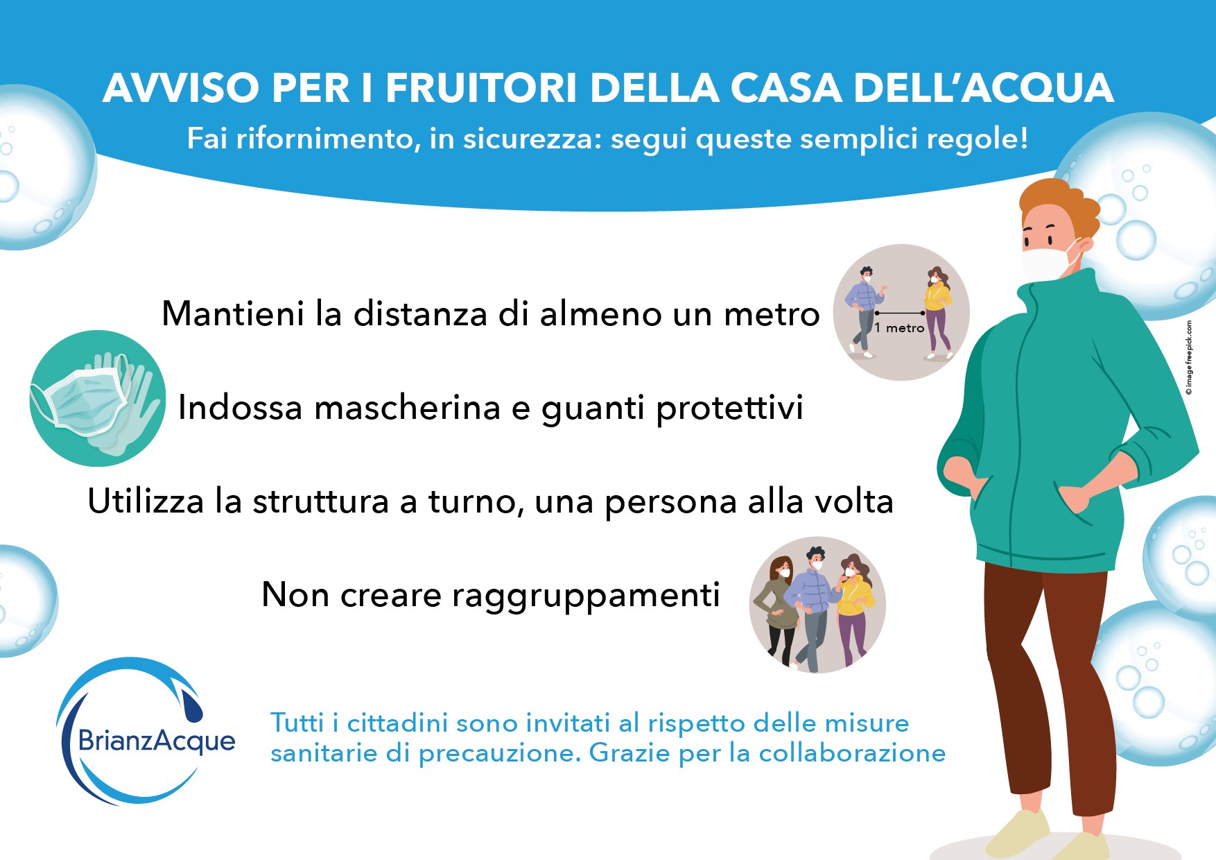 BrianzAcque è disponibile a riaprire le casette. Per quelle che riprenderanno a dispensare il servizio alla popolazione, verrà potenziato il servizio di pulizia e di sanificazione con interventi bisettimanali. I prelievi di acqua saranno gratuiti, fino a nuova comunicazione. Nel fare rifornimento, gli utenti dovranno attenersi scrupolosamente alle indicazioni dettate dal Governo in materia di igiene e, in particolare, evitare assembramenti, mantenendo almeno 1 metro di distanza tre le persone in coda e indossando guanti e mascherina.