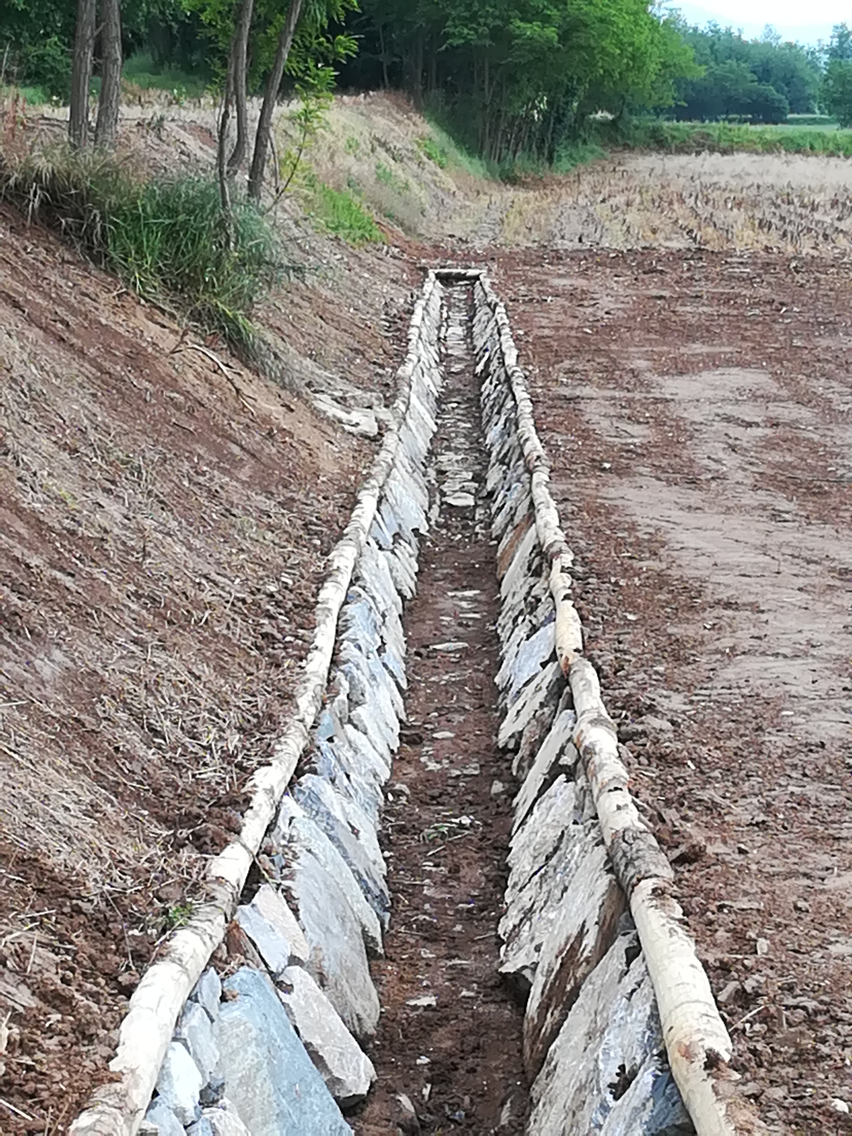 Inizialmente, le acque meteoriche vengono drenate da un tratto di strada in ghiaia, che intercetta le acque provenienti dai campi e dirette verso la strada. Quindi, l'acqua viene raccolta tramite una griglia e convogliata, tramite un tubo interrato, all'interno di una canaletta a cielo aperto realizzata con tecniche di ingegneria naturalistica.