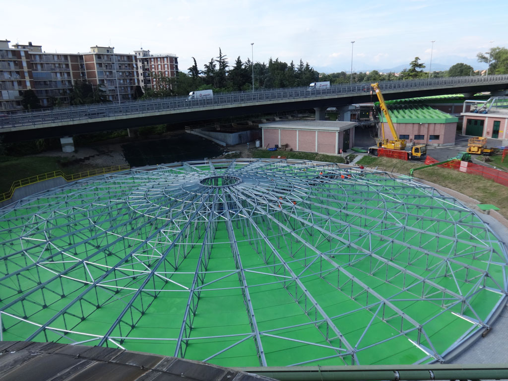 Copertura della prima vasca di sedimentazione primaria: cantiere concluso in tempo, come da cronoprogramma e da countdown. Nonostante le abbondanti piogge degli ultimi tre mesi, nonostante gli immancabili imprevisti che hanno rallentato l’attività, BrianzAcque, proprietaria e gestore del depuratore di San Rocco, ha mantenuto gli impegni promessi. L’invaso circolare più grande e più vicino al nucleo abitato, non è più a cielo aperto, ma si è trasformato in un edificio dal design avveniristico, chiuso e sigillato. Sormontato da struttura composta da 36 travi alle quali sono stati agganciati ad uno ad uno, pannelli verdi in vetroresina. Un lavoro importante sotto il profilo ingegneristico che in mattinata è stato mostrato ad autorità istituzionali, comitato di quartiere e giornalisti nel corso di un incontro a cui ha fatto seguito un sopralluogo al cantiere dove ora sorge il sedimentatore coperto più grande d’Italia e tra i più grandi d’Europa.