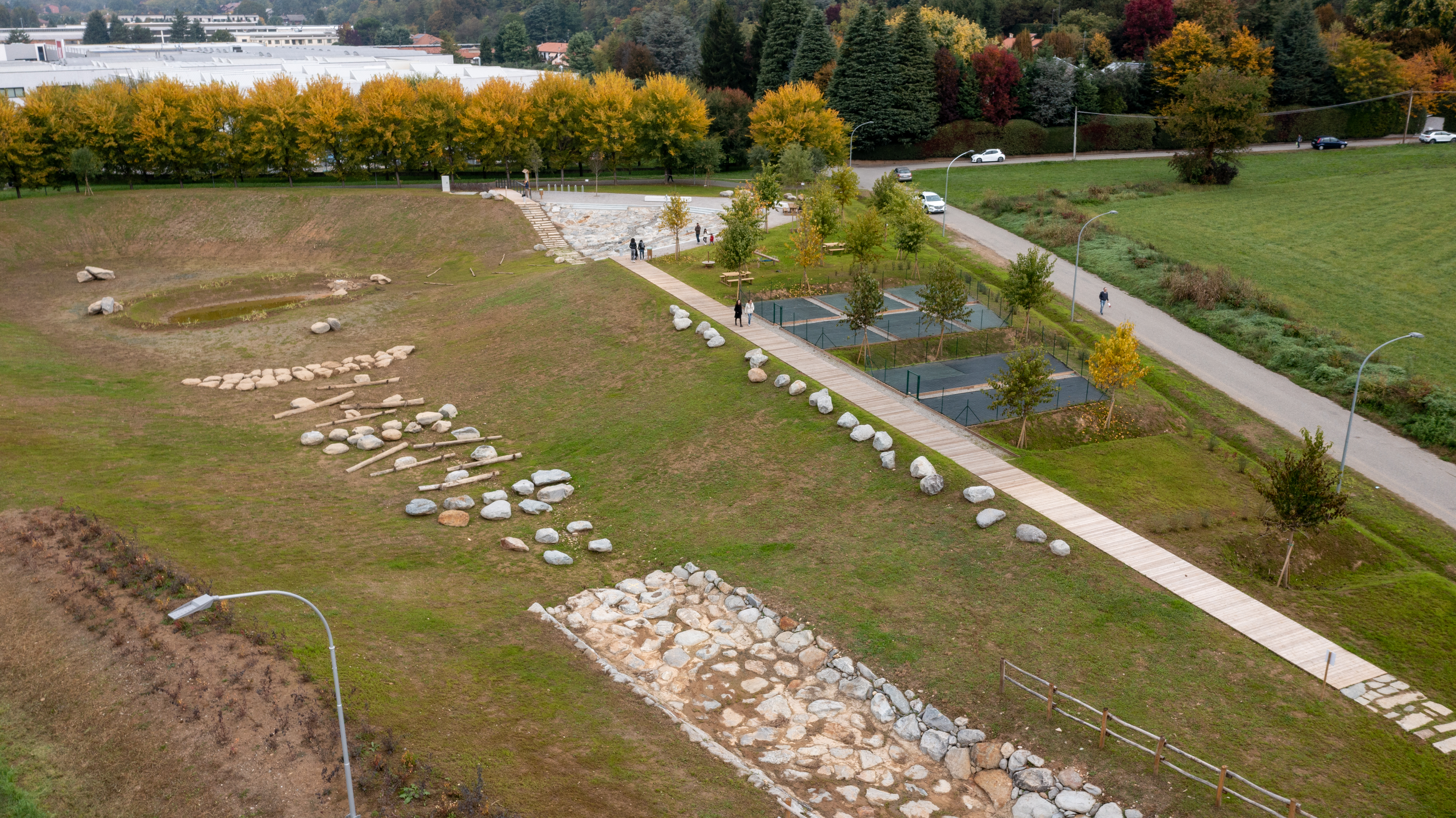Protettivo. Naturalistico. E partecipativo. Visivamente, la struttura base del Parco dell’Acqua con leit motiv il paesaggio dell’oro blu, si compone di un bacino di infiltrazione per la raccolta delle acque meteoriche. Un grande invaso naturale, piantumato con specie di vegetazione igrofila, in grado di accogliere, di accumulare acqua fino a una capienza di 14 mila metri cubi, per poi disperderla lentamente. Un prato verde su cui, in assenza di pioggia, si può tranquillamente camminare, simbolo e landmark dello stesso parco. Tutt’attorno, l’infrastrutturazione verde, concepita come opportunità per ricostruire ambiente e paesaggio con l’ambizione di promuovere una nuova cultura ecologica e di offrire funzioni di uso comunitario. E così sono stati ricavati un laghetto, sentieri e percorsi pedonali fino a intercettare i tracciati ciclopedonali già esistenti con aree di sosta per il pic nic, spazi per attività ludiche e didattico-educative per bimbi e adulti. Ancora: orti comuni, limitati da canali d’acqua piovana per l’irrigazione, a garanzia di una gestione sostenibile e consapevole della risorsa idrica. E naturalmente, giochi d’acqua autoalimentati attraverso sistemi di pompaggio senza l’utilizzo di energia elettrica. L’intero contesto risulta abbellito dalla piantumazione di elementi tipici del paesaggio agrario brianzolo: filari, prato, alberi solitari ed elementi d’arredo urbano realizzati con materiali assolutamente naturali e riciclabili.