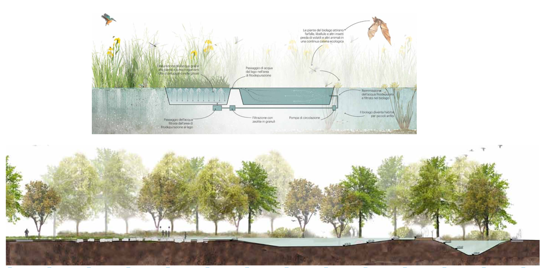 Come negli altri format di Parchi dell’Acqua, gli interventi per l’ottimizzazione anche tecnologica dei sistemi idraulici finalizzati alla corretta gestione delle acque meteoriche si accompagnano ad una rigenerazione complessiva della zona sotto l’aspetto ambientale e paesaggistico in cui l’acqua rappresenta l’aspetto da esaltare per la valorizzazione del grande parco pubblico. E’ così ad esempio che il biolago, sarà dotato di un’area per la fitodepurazione in modo che la risorsa idrica torni a “ripulirsi ” attraverso un sistema composto da piante igrofile e apposite ghiaie. Non solo: per essere più attrattivo lo specchio d’acqua permanente sarà movimentato da zampilli e cascatelle in funzione sia ornamentale, sia di movimentazione e di riossigenazione dell’acqua. L’dea è di un’area umida permanente allo scopo di creare un'oasi di biodiversità per l'avifauna e per gli anfibi, nonché per diverse specie arboree. Tutt’attorno panchine, sentieri, spazi per la sosta, giochi d’acqua per bambini, percorsi ciclopedonali e una vegetazione che ripropone la tipicità del paesaggio agrario brianzolo: zone boschive, filari, prati, alberi solitari. A lavori completati, questa grande oasi verde, diventerà luogo di immersione nella natura per grandi e piccini con scenari di coesione sociale, di partecipazione e di attività ludico-educative.