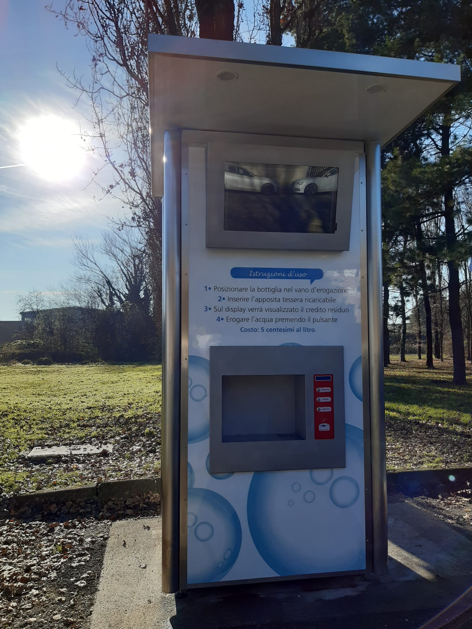 L’H2O distribuita dalle casette è la stessa, proveniente dall’acquedotto, che esce dal rubinetto di casa, ulteriormente affinata da un sistema di filtrazione a carboni attivi per eliminare eventuali tracce di odori e/o sapori sgradevoli, senza dispersione delle qualità organolettiche e da un trattamento di sterilizzazione a raggi U.V., che ne migliora ulteriormente le caratteristiche di salubrità.