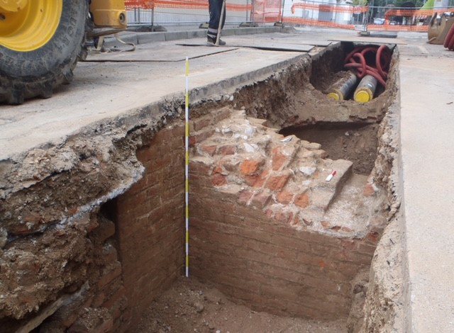 Fig. 1. Monza, Via Parini. L’imprevisto archeologico prevedibile. La posa delle condutture del teleriscaldamento si scontra con i resti delle mura viscontee della città il cui tracciato è noto dalla cartografia storica. Archivio fotografico Soprintendenza Archeologia della Lombardia.