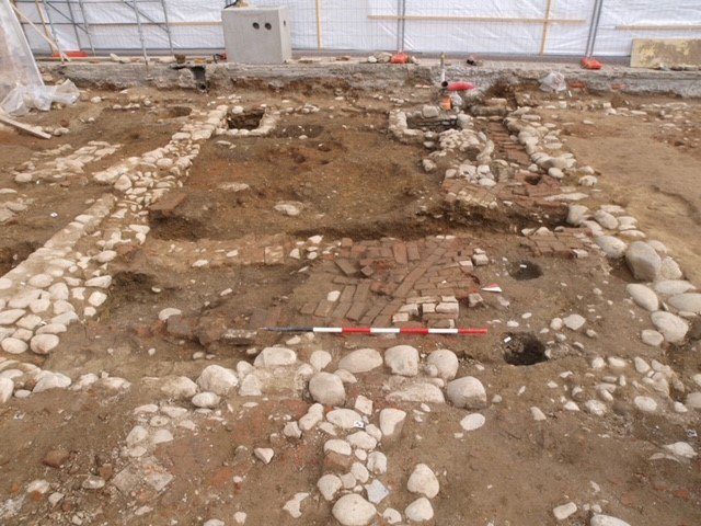 Fig. 2. Vimercate, Via Vittorio Emanuele II. L’imprevisto archeologico prevedibile. Sotto i piani pavimentali di un demolito edificio del centro storico riemergono i muri di un atelier di lavorazione del metallo di età post-medievale che, a loro volta, coprivano resti di età romana. Il centro storico di Vimercate è noto per rinvenimenti analoghi, effettuati anche in stretta prossimità con l’area di cantiere. La mancata previsione della necessità di scavi archeologici ha comportato un notevole aumento dei costi di realizzazione. Archivio fotografico Soprintendenza Archeologia della Lombardia.